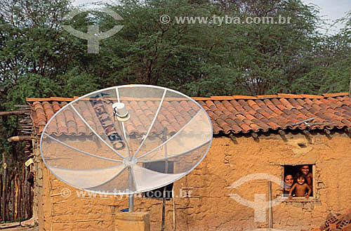 •  Family at the window of a clay house with a satellite antenna in the foreground - Areia Branca city - Mossoro - Rio Grande do Norte state - Brazil