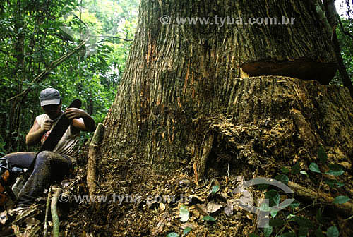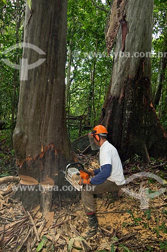 •  Man cutting the Chestnut Tree with a electric saw - deforestation - Amazonian - Brazil