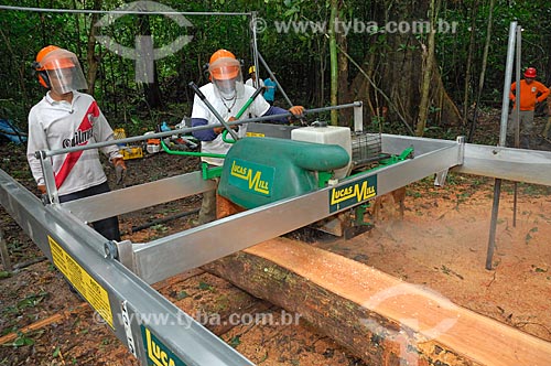 •  Wood being cut with portable sawmill used to avoid dragging the logs with tractors by a long way through the forest, and so destroying more than necessary, in the communitary management system of Mamiraua Reserve   - Tefe city - Brazil
