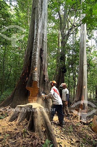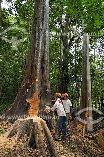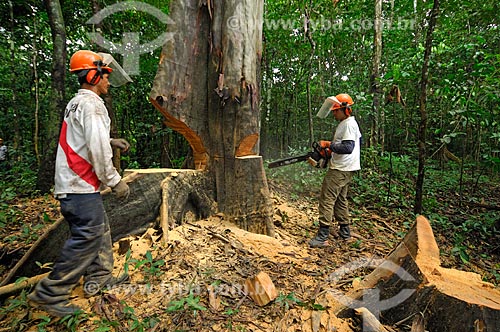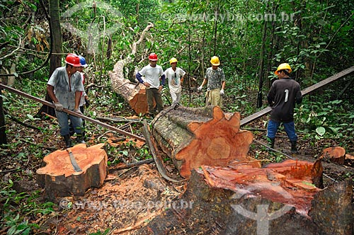 •  Tree being cut by workers who dragging the wood just a short distance until a portable sawmill to avoid dragging the logs with tractors a long way through the forest, and so destroying more than necessary, in the communitary management sys  - Tefe city - Brazil