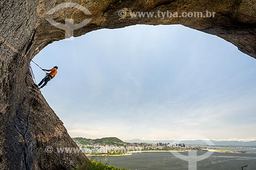 •  Practitioner of slackline - ibis of the Sugarloaf - hollow of the Sugar Loaf stone forming the silhouette of a bird  - Rio de Janeiro city - Rio de Janeiro state (RJ) - Brazil