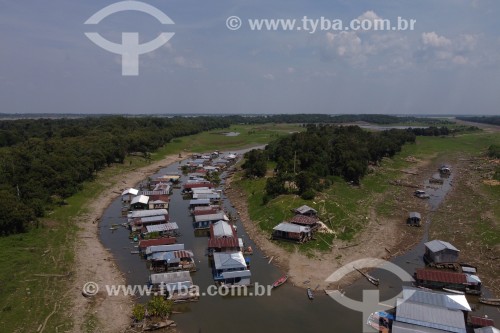 Picture taken with drone of floating houses in the community of Catalao Lake during the dry season in the Amazon rivers - Careiro da Varzea city - Amazonas state (AM) - Brazil