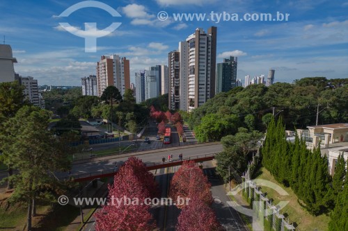 Picture taken with drone of the Deputado Heitor Alencar Furtado Street with flowering trees - Curitiba city - Parana state (PR) - Brazil