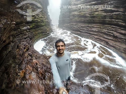 Man making a selfie while diving - Almecegas II Waterfall - Chapada dos Veadeiros National Park - Alto Paraiso de Goias city - Goias state (GO) - Brazil
