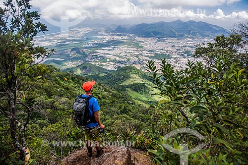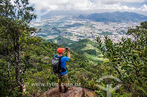 Man photographing the view of west zone from Mirante of Papagaio small ridge mountain - Rio de Janeiro city - Rio de Janeiro state (RJ) - Brazil