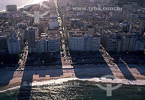 •  Aerial view of Copacabana Beach with the shadows of buildings cast across the sand by the setting sun - Rio de Janeiro city - Rio de Janeiro state - Brazil