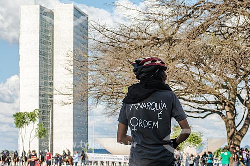 Protester with shirt that say: Anarchy is order - during demonstration against the government of Michel Temer - Esplanade of Ministries - with the National Congress in the background - Brasilia city - Distrito Federal (Federal District) (DF) - Brazil