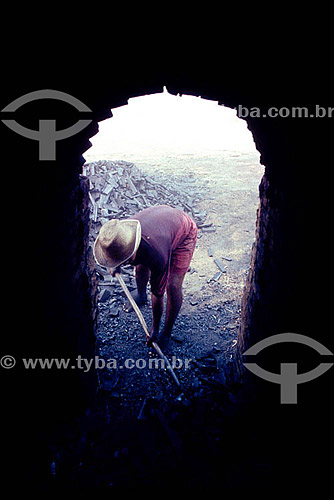 •  Inhabitant of the Amazonian - Charcoal burner working the charcoal with a shovel - Amazonas state - Brazil