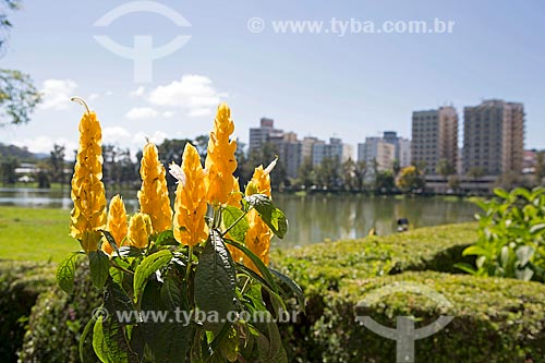 Detail of flower of the golden shrimp plant (Pachystachys lutea) on the banks of the Sao Lourenco Lake - Aguas de Sao Lourenco Park - with buildings in the background - Sao Lourenco city - Minas Gerais state (MG) - Brazil