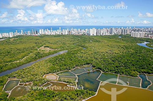 •  Aerial photo of the shrimp farming - Manguezais Park (Mangroves Park) with the buildings of Boa Vista neighborhood in the background  - Recife city - Pernambuco state (PE) - Brazil