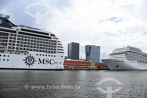 View of the cruise ships with the headquarters building of the LOréal Brasil and the Vista Guanabara building during the Rio Boulevard Tour - boat sightseeing in Guanabara Bay - Rio de Janeiro city - Rio de Janeiro state (RJ) - Brazil