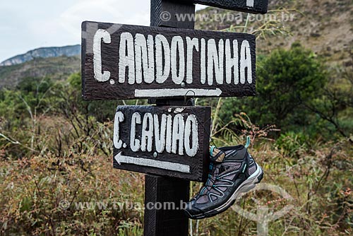 Detail of tennis dried on a trail board in the Serra do Cipo National Park indicating the directions to the Andorinhas Waterfall (on the right) and the Gaviao Waterfall (on the left) - Jaboticatubas city - Minas Gerais state (MG) - Brazil