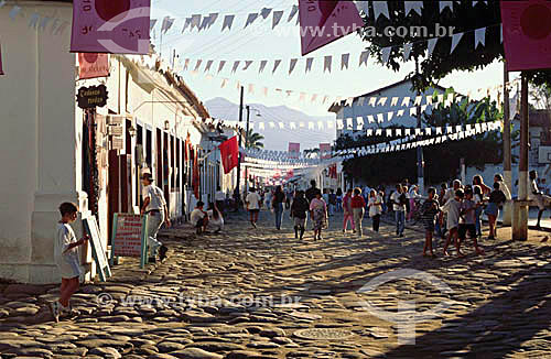 •  People at Matriz square decorated with small flags - Parati city - Rio de Janeiro state south coast - Brazil