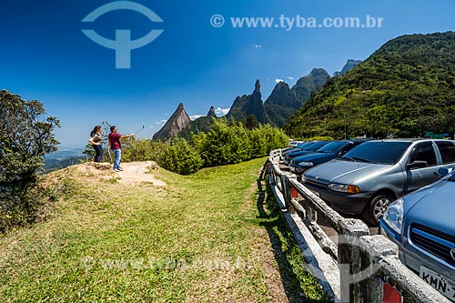 •  Couple making a selfie with the Escalavrado, Dedo de Nossa Senhora, Dedo de Deus, Cabeca de Peixe, Santo Antonio and Sao Joao Peaks from Soberbo Mirante (Superb Mirante) - Serra dos Orgaos National Park  - Teresopolis city - Rio de Janeiro state (RJ) - Brazil
