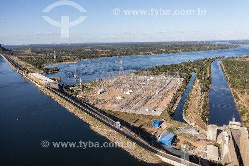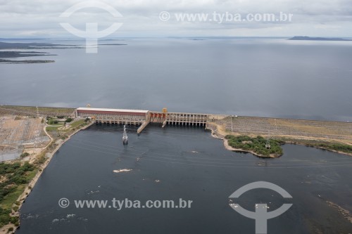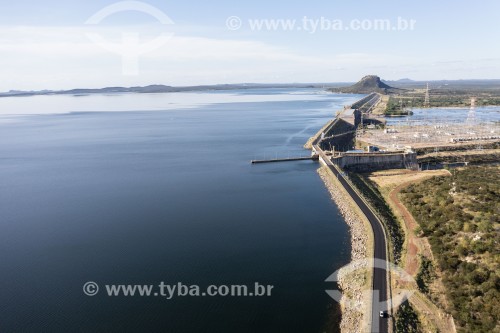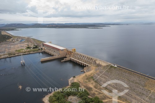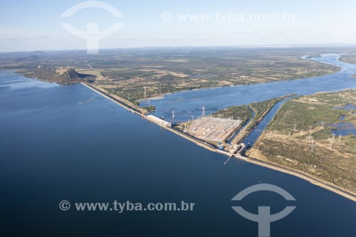 Picture taken with drone of the Sobradinho Hydroelectric Power Plant dam with maximum water capacity - Sobradinho city - Bahia state (BA) - Brazil