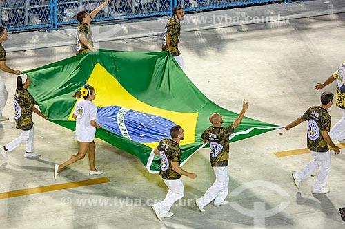 •  Parade of Gremio Recreativo Escola de Samba Unidos de Vila Isabel Samba School - support team closing the parade carrying the Brazilian Flag - Plot in 2019 - In the name of the Father, the Son and the Saints, the Village sings the city of Peter  - Rio de Janeiro city - Rio de Janeiro state (RJ) - Brazil
