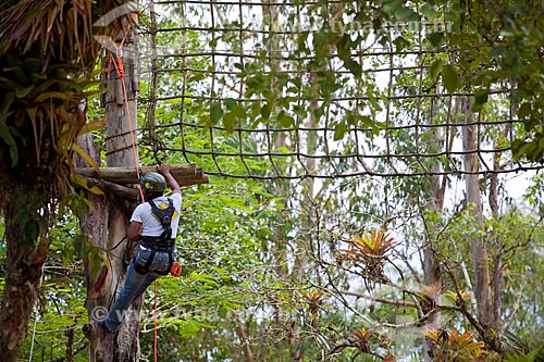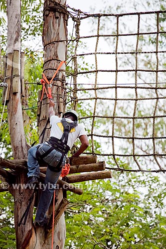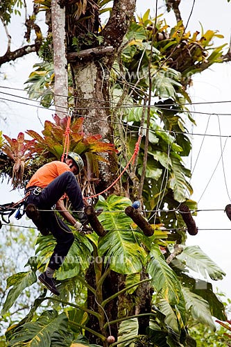 •  Subject: Man climbing a tree using the safety equipment for the practice of ropes course / Place: Paraty city - Costa Verde (Green Coast) region - Rio de Janeiro state - Brazil / Date: Janeiro 2010