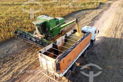 • Picture taken with drone of harvester unloading Soybean in Bulk Truck - Planalto city - Sao Paulo state (SP) - Brazil