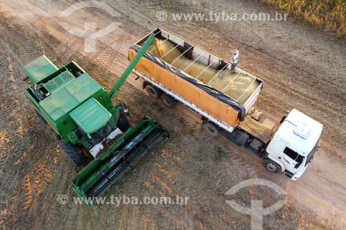Picture taken with drone of harvester unloading Soybean in Bulk Truck - Planalto city - Sao Paulo state (SP) - Brazil