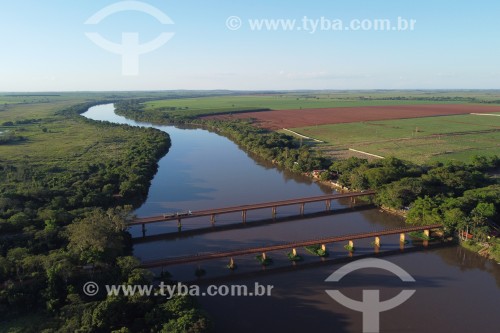 • Picture taken with drone of the Pardo River with the bridge on the Assis Chateaubriand Highway (SP-425) - boundary between the municipalities of Guaira and Barretos - Guaira city - Sao Paulo state (SP) - Brazil