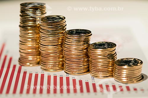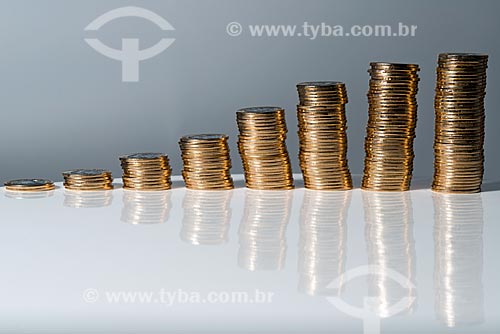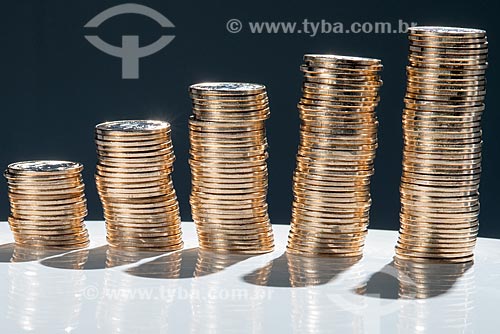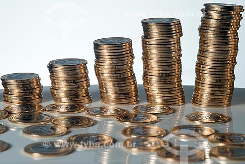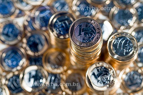 •  Brazilian currency - Real - coins of 1 real stacked  - Rio de Janeiro city - Rio de Janeiro state (RJ) - Brazil