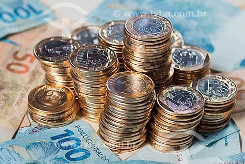 •  Brazilian currency - Real - coins of 1 real stacked over of banknote of 50 and 100 real  - Rio de Janeiro city - Rio de Janeiro state (RJ) - Brazil