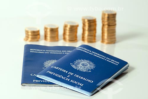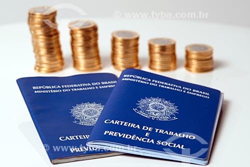 Brazilian currency - Real - coins of 1 real stacked with work permit - Rio de Janeiro city - Rio de Janeiro state (RJ) - Brazil
