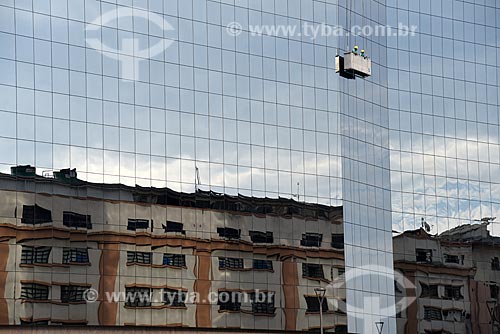 •  Reflex of building on the facade of the Rio de Janeiro Stock Exchange (BVRJ) with men cleaning the glass  - Rio de Janeiro city - Rio de Janeiro state (RJ) - Brazil