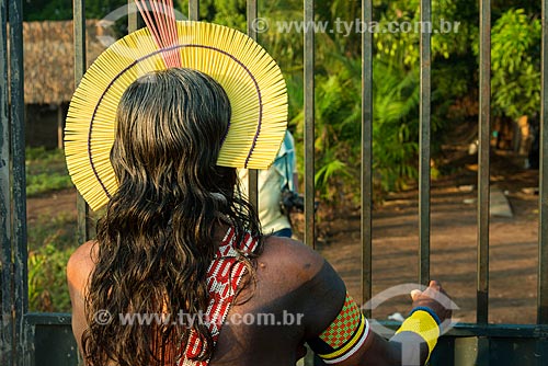 Indian with cocar made of plastic drinking straw - to not use bird feather - Moikarako Tribe - Kayapo Indigenous Land - Sao Felix do Xingu city - Para state (PA) - Brazil