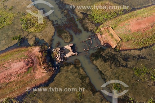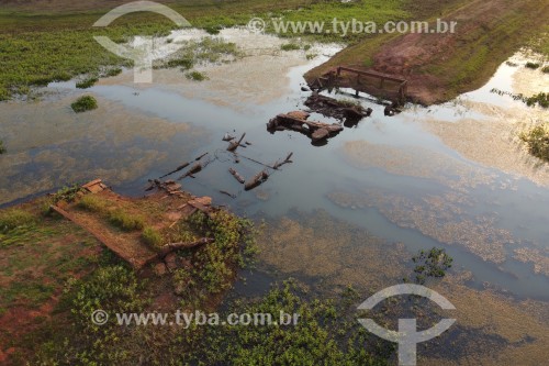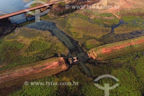 • Picture taken with drone of old dirt road and the old bridge that reappeared after 40 years submerged in the Ribeirao Padua Diniz, which is an arm of the water reservoir of the Agua Vermelha hydroelectric plant - Indiapora city - Sao Paulo state (SP) - Brazil
