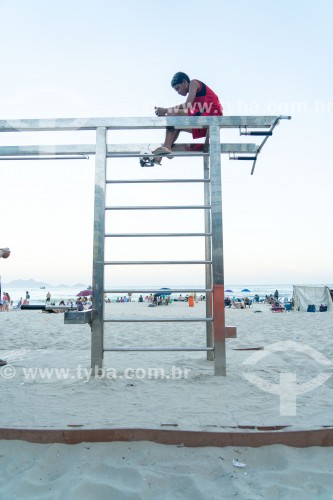Young man on top of exercise equipment on Copacabana Beach - Rio de Janeiro city - Rio de Janeiro state (RJ) - Brazil