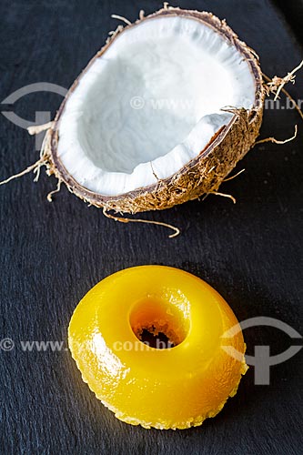 •  Detail of quindim and coconut cut in half  - Santa Catarina state (SC) - Brazil