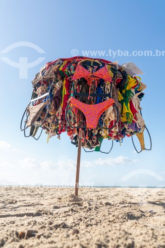 Improvised sun umbrella as a display for selling bikinis on Copacabana Beach - Rio de Janeiro city - Rio de Janeiro state (RJ) - Brazil