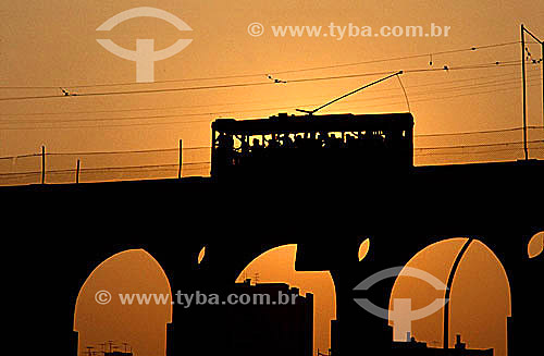 Silhouette of people on the "Bonde" (Tram) also known as "Bondinho de Santa Teresa" crossing the "Arcos da Lapa" (Lapa Arches)* at sunset - Rio de Janeiro city - Rio de Janeiro state - Brazil * A Roman-style aqueduct from the mid-eighteenth-century