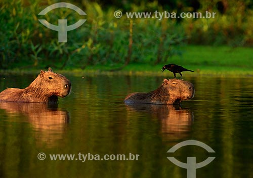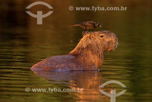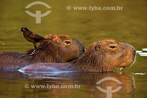•  Capybara (Hydrochoerus hydrochaeris) with tropical kingbird (Tyrannus melancholicus) - Pantanal Matogrossense  - Corumba city - Mato Grosso do Sul state (MS) - Brazil