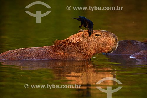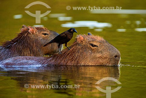 •  Subject: Giant Cowbird (Molothrus oryzivorus) perched in Capybara (Hydrochoerus hydrochaeris) feeding on insects / Place: Pocone city - Mato Grosso state (MT) - Brazil / Date: 10/2012
