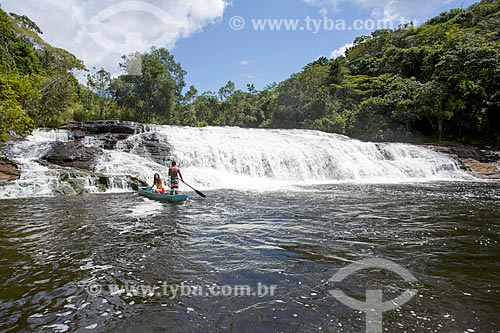 Couple - canoe in the Marau River with the Tremembe Waterfall in the background - Marau city - Bahia state (BA) - Brazil
